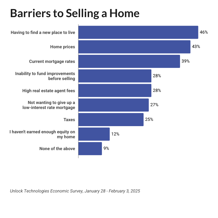 Selling your home these days is not high on the list of priorities for American homeowners. In a recent survey Unlock conducted, we learned that 60% of homeowners were unsure or didn’t think that 2025 would be a good year to sell a home. The reasons are varied. The chart below reveals what our respondents said would be barriers to selling their homes: